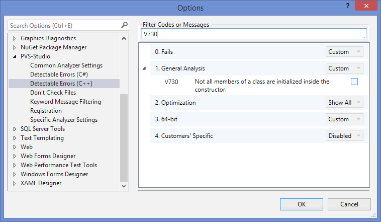 One more analyzer setting that turned out to be very useful - disabling groups of diagnostic rules. Why can it be relevant? For example, there were about 70 warnings V730 (not all the class members are initialized in the constructor). These warnings really need reviewing, because they might signal about hard-to-detect bugs. Nevertheless, it may not be clear to a person, who is not much familiar with the code, if the uninitialized member will lead to problems or there is another tricky way of it further initialization. For an article, these errors aren't much interesting too. That's why, the developers should really review them and we won't focus on it here. Therefore, we have a goal - to disable a whole group of diagnostic rules. It can be easily done: in settings of the PVS-Studio plugin you should just uncheck the necessary diagnostic.
