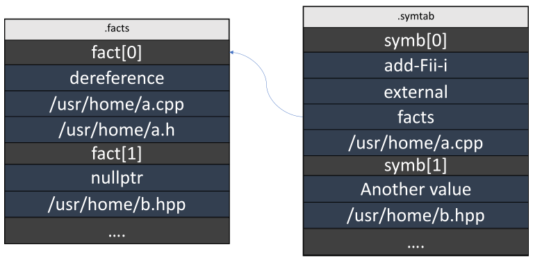 Just like with symbols, header contains information about the number of entries. These entries consist of references to symbols, and various facts for them. The facts are encoded as a fixed length tuple — this makes them easier to read and write. At the time of writing this article, facts are saved only for functions and their arguments. We do not yet save information about symbolic execution that the analyzer performs for the returned function values.