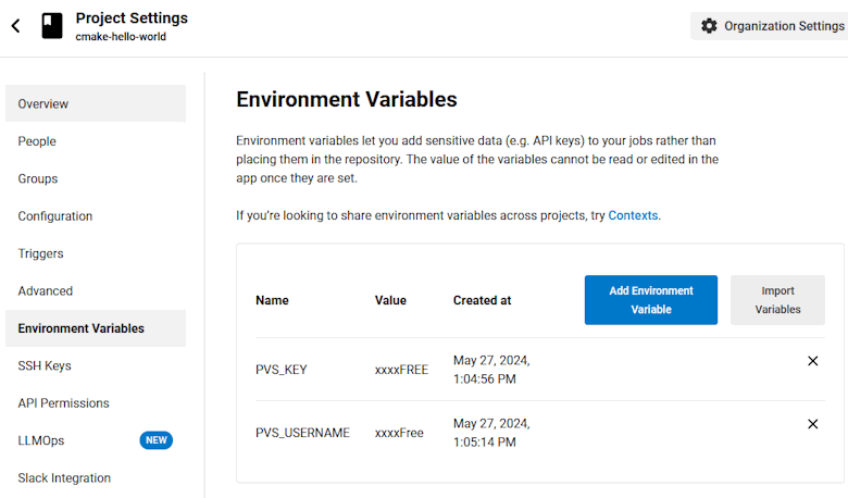 In the settings window, access the 'Environment Variables' section and create the 'PVS_USERNAME' and 'PVS_KEY' variables that contain your PVS-Studio username and license key.