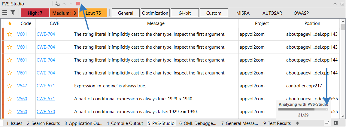 When running the analysis with any of the listed methods, a window with the analysis progress will appear in the notification area. The analyzer warnings will appear in the table as they are received. You can stop the analysis that has already started using a special button in the header of the output panel. Alternatively, you can click "cross" that is located at the end of the notification progress bar (hover the cursor over the progress bar to see it).