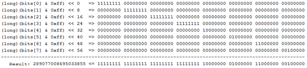 For a better understanding of this, let's see what happens when this code is executed over the value '289077008695033855' as an example. When cast to an array of bytes, this value will look as follows: